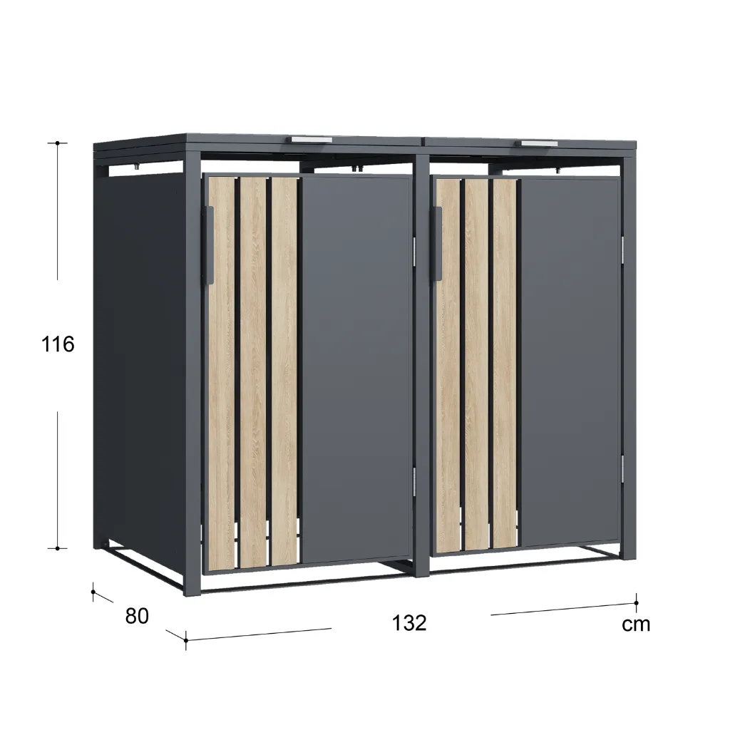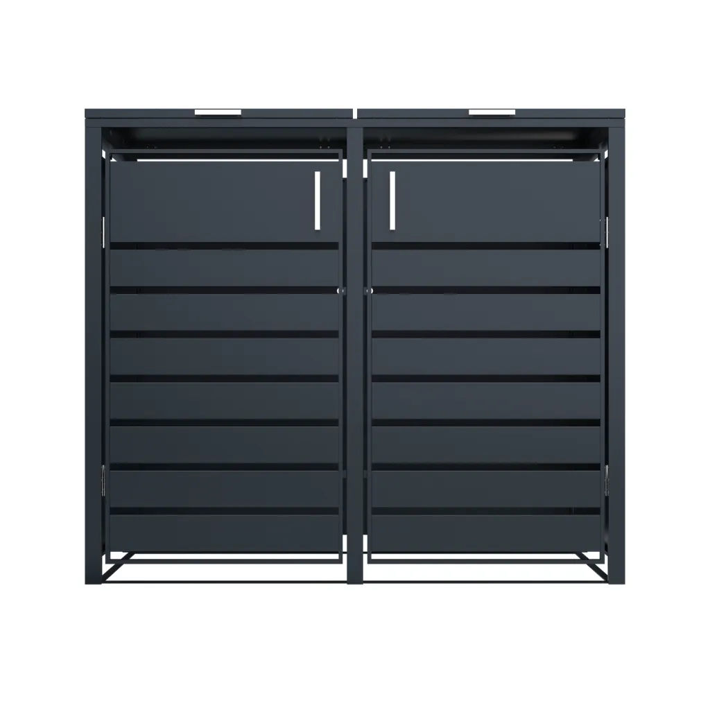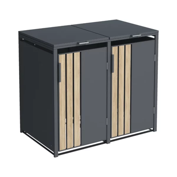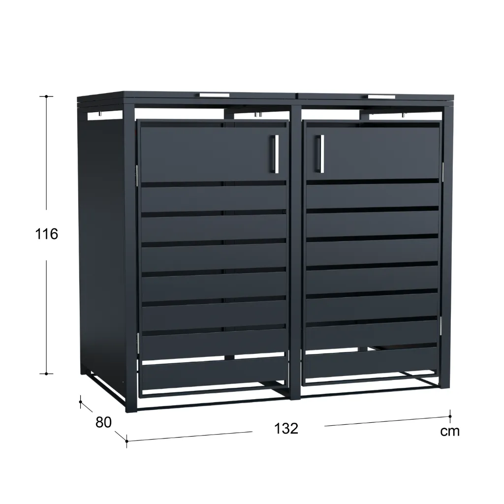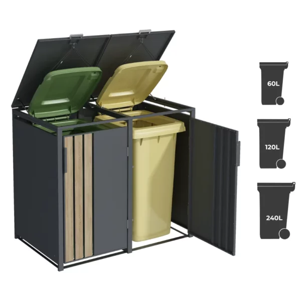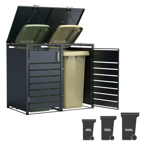 Le côté pratique de cet abri poubelle métal a été pensé dans les moindres détails. Par conséquent, il est compatible avec une large gamme de bacs à déchets standards. Ainsi, il s’adapte aussi bien aux formats compacts de 60 L qu’aux plus grands de 120 L ou 240 L. Il peut donc abriter 2 poubelles distinctes.