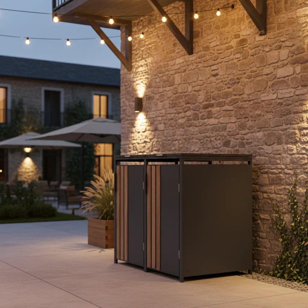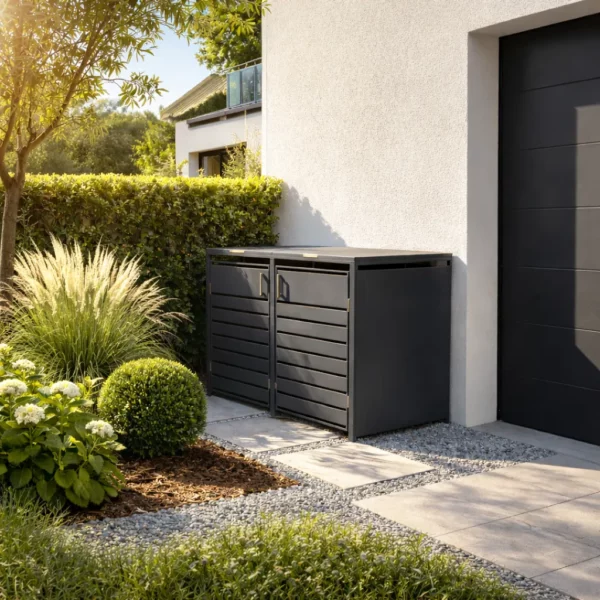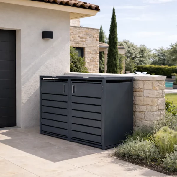 Notre abri poubelle métal se distingue par son esthétique soignée et contemporaine. En effet, doté d’un toit plat, il offre des lignes épurées qui s’intègrent parfaitement dans tout type d’environnement. Par conséquent, le but est clair : dissimuler efficacement vos bacs à déchets tout en embellissant votre extérieur. Que vous souhaitiez l’installer derrière votre maison, le long d’une allée ou au cœur de votre jardin, son design apporte une touche moderne et naturelle. C’est la solution idéale pour un rangement propre et ordonné.