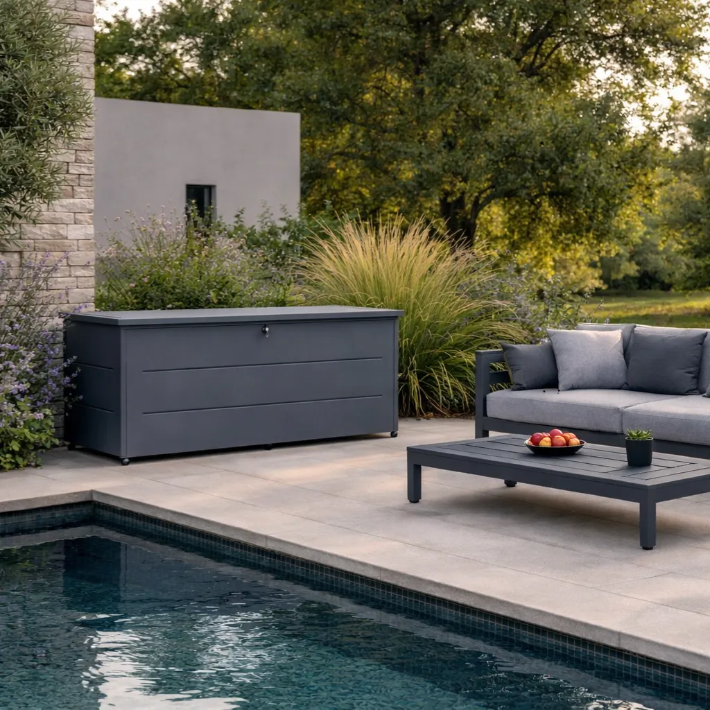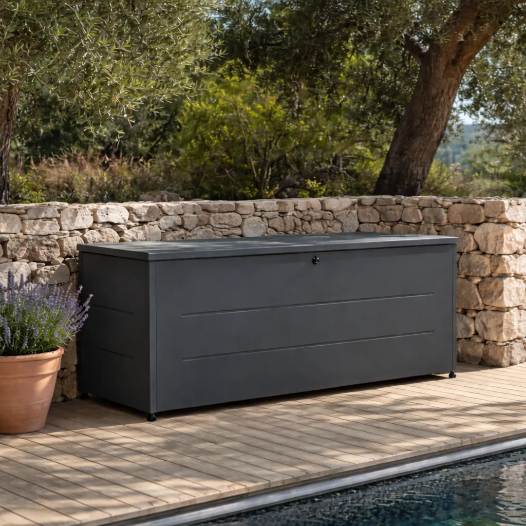 Ce coffre spacieux permet de stocker de nombreux équipements. Par exemple, il accueille facilement les coussins de salon de jardin. Il convient aussi aux outils, aux accessoires de terrasse et au matériel de plein air. De cette manière, vos affaires restent protégées des intempéries.